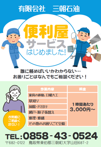 [三朝温泉のスタンド(有)三朝石油] 便利屋サービスを新たに始めます!
